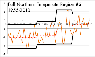 If there were absolutely no warming trend anywhere in any season, this Winter pattern would be very typical. Any one of our four time periods could the record high and any one of them could have the record low. The first interval would have a higher reading than the last period at least 50% of the time, possibly more since 1999-2010 is 12 years and 1955-1975 is 21 years.
